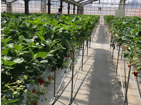 広大なハウスの中はとても暖かく受粉のためミツバチが飛んでいます。