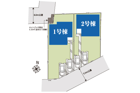 | 接道状況 | 南東側5.5m道路、北側2.91m位置指定道路 | 延床面積 | ①103.92m²、②103.92m² |