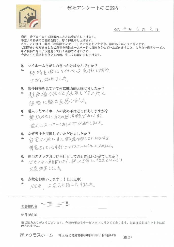 結婚を機に何も分からず気軽に相談から始まったマイホーム探し!!現在の自宅から近く、スーパー等も近くにあった事や月々の住宅ローンの支払いも無理がなかった事が購入する決めてとなった!!『宮代町』新築一戸建て | 杉戸町周辺の新築・不動産のことならエクラスホーム