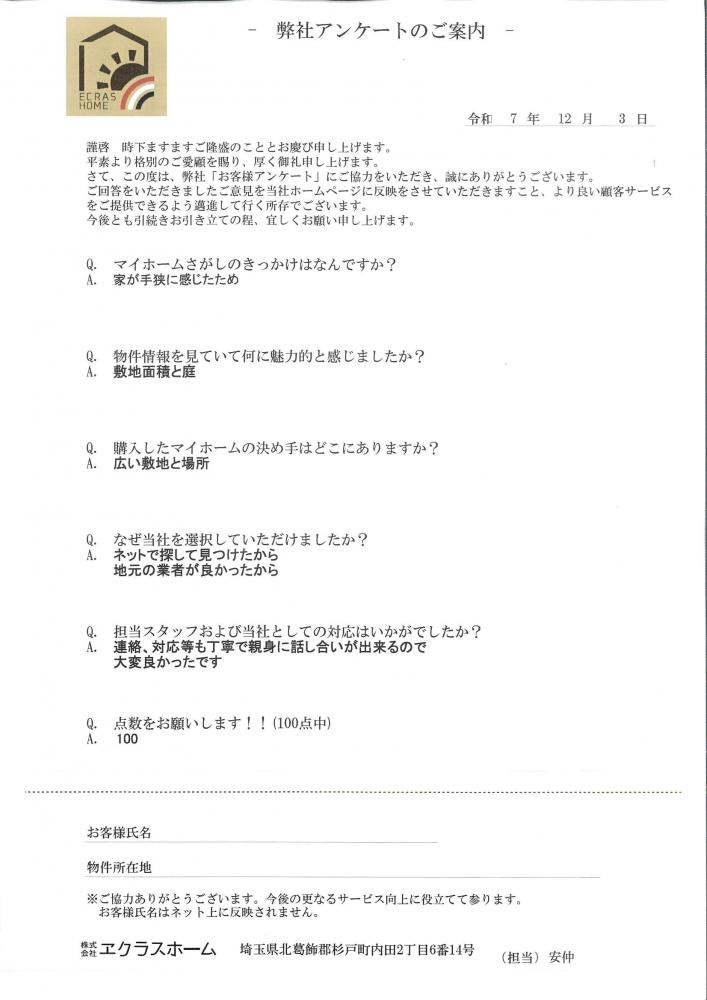 現在の自宅が手狭になり庭のあるマイホーム探しを開始。地域に密着した地元の業者を選択した結果、親切、丁寧な対応で安心して購入をすることが出来た。『さいたま市岩槻区』新築一戸建て | 杉戸町周辺の新築・不動産のことならエクラスホーム