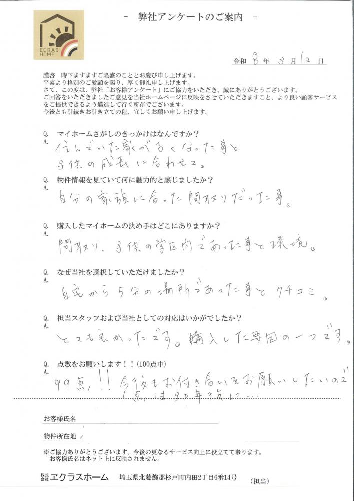 学区内でのマイホーム探しだったため、物件数も限られる中で間取りや環境等を含めて大変ご家族にマッチした物件をご提案できたことを大変嬉しく思います。