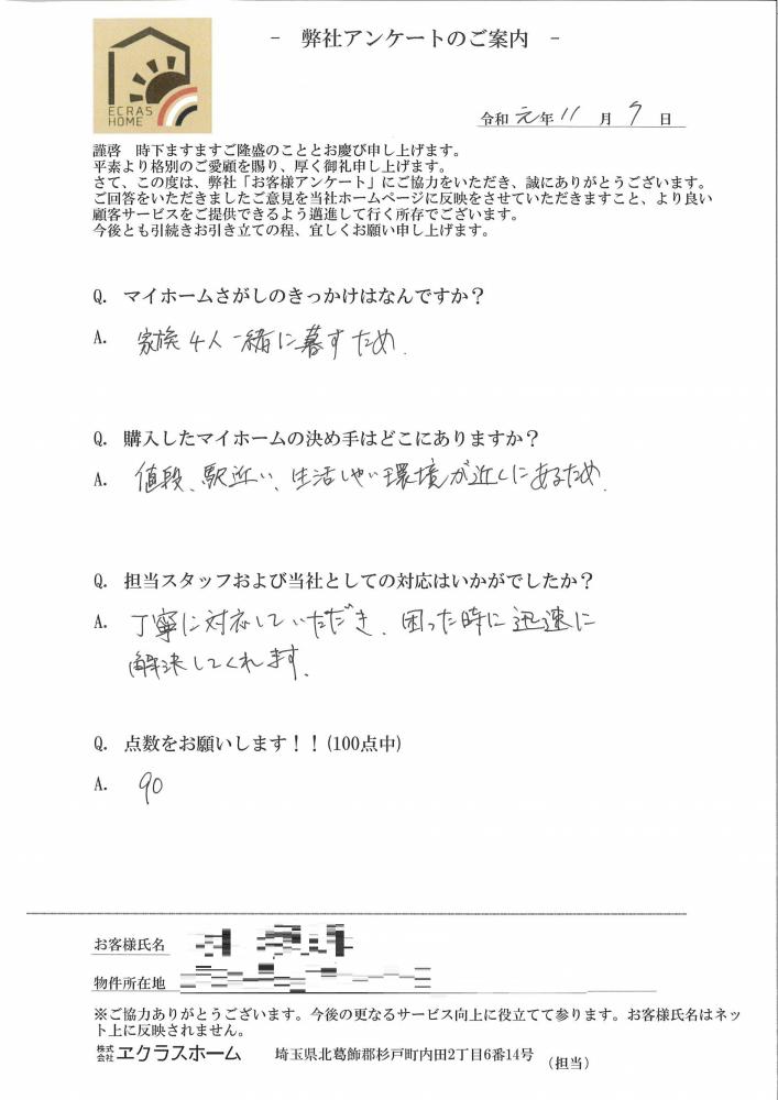 物件近くに親戚の家があり、生活環境を含めて利便性の良さが決めてとなった!!また、駅からの距離も近く通勤時間の短縮にも繋がった!!『蕨市』新築一戸建て